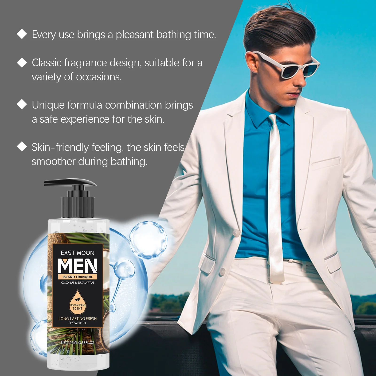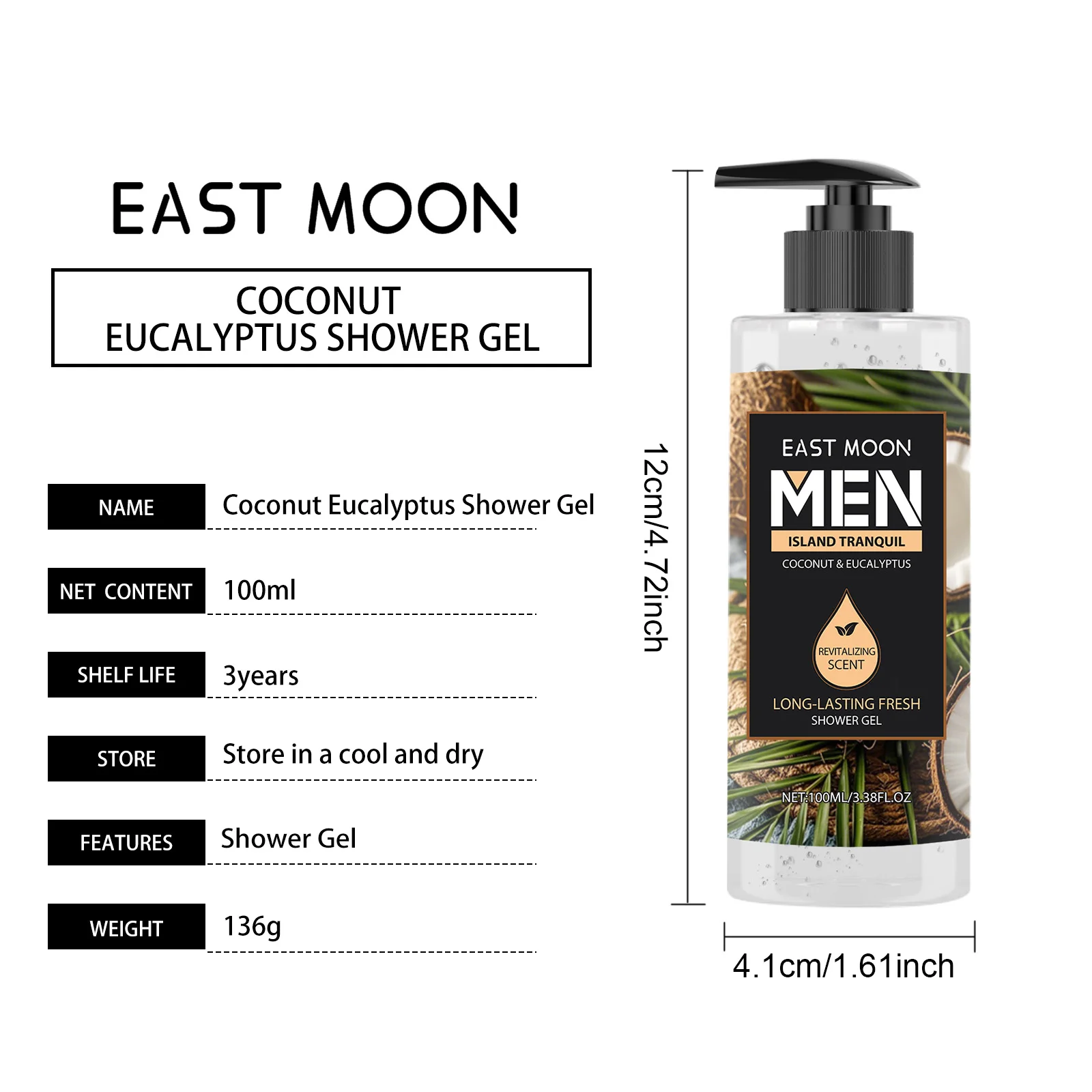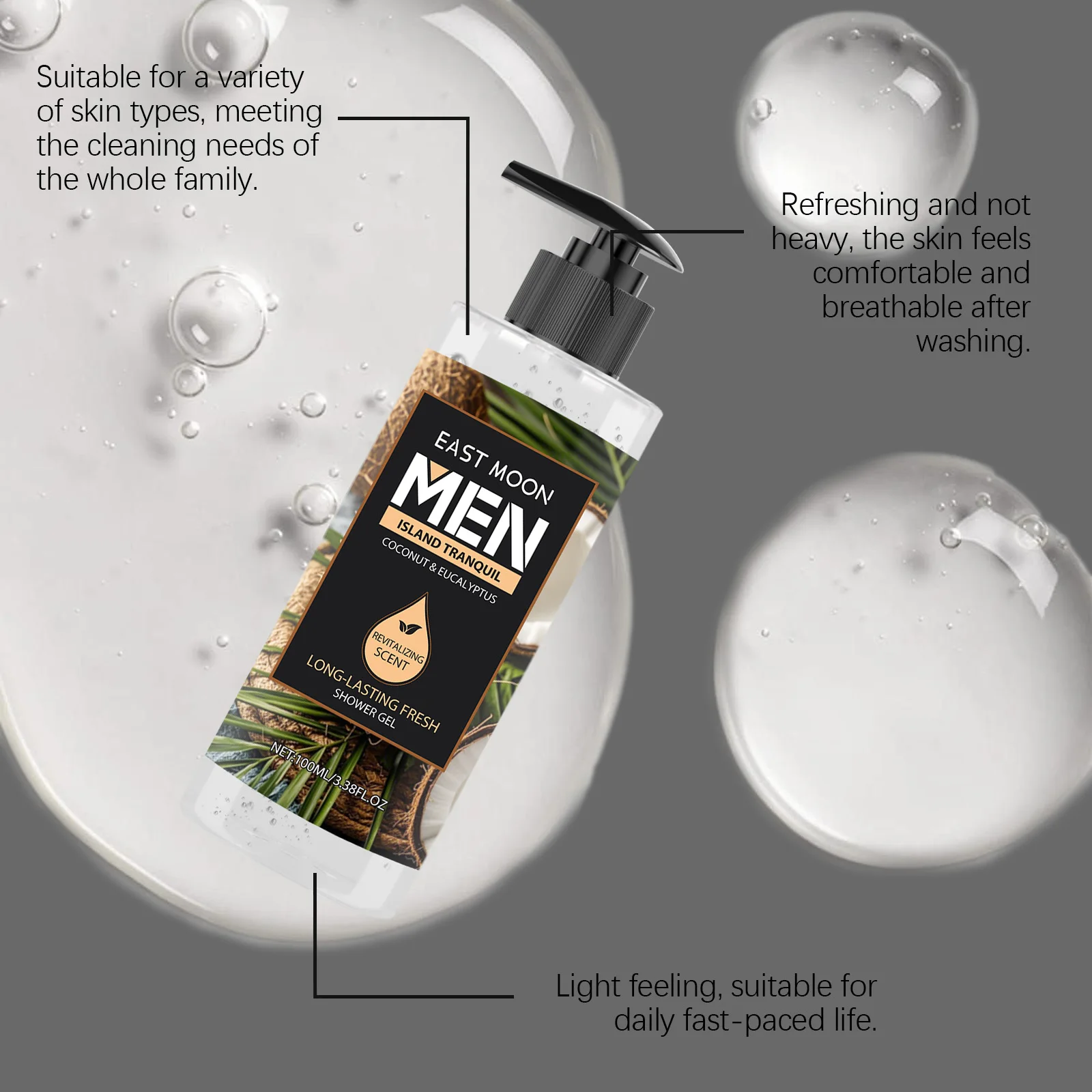 Level up your daily routine with our Eucalyptus Coconut Men's Shower Gel. Specifically engineered for the modern man, this deep cleansing body wash tackles the day's grime, sweat, and excess oil without stripping your skin's natural moisture. The unique blend of natural extracts leaves your skin feeling exceptionally clean, refreshed, and energized.Specifications